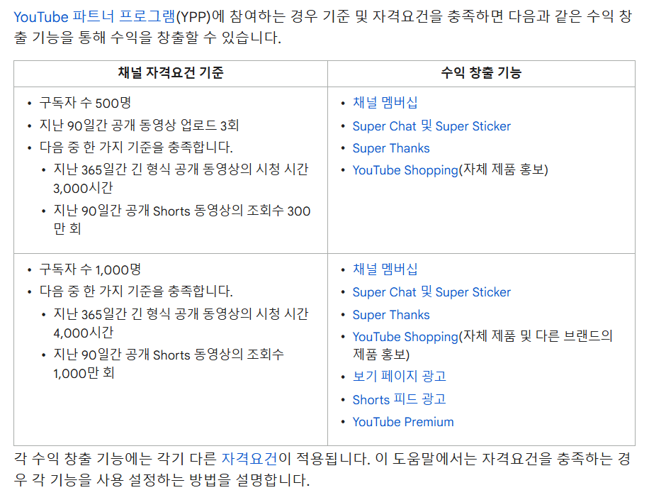 - 슈퍼챗(후원)-> 구독자 500명 & 1년이내 긴 영상 시청시간 3000시간 or 90일이내 shorts 조회수 300만회